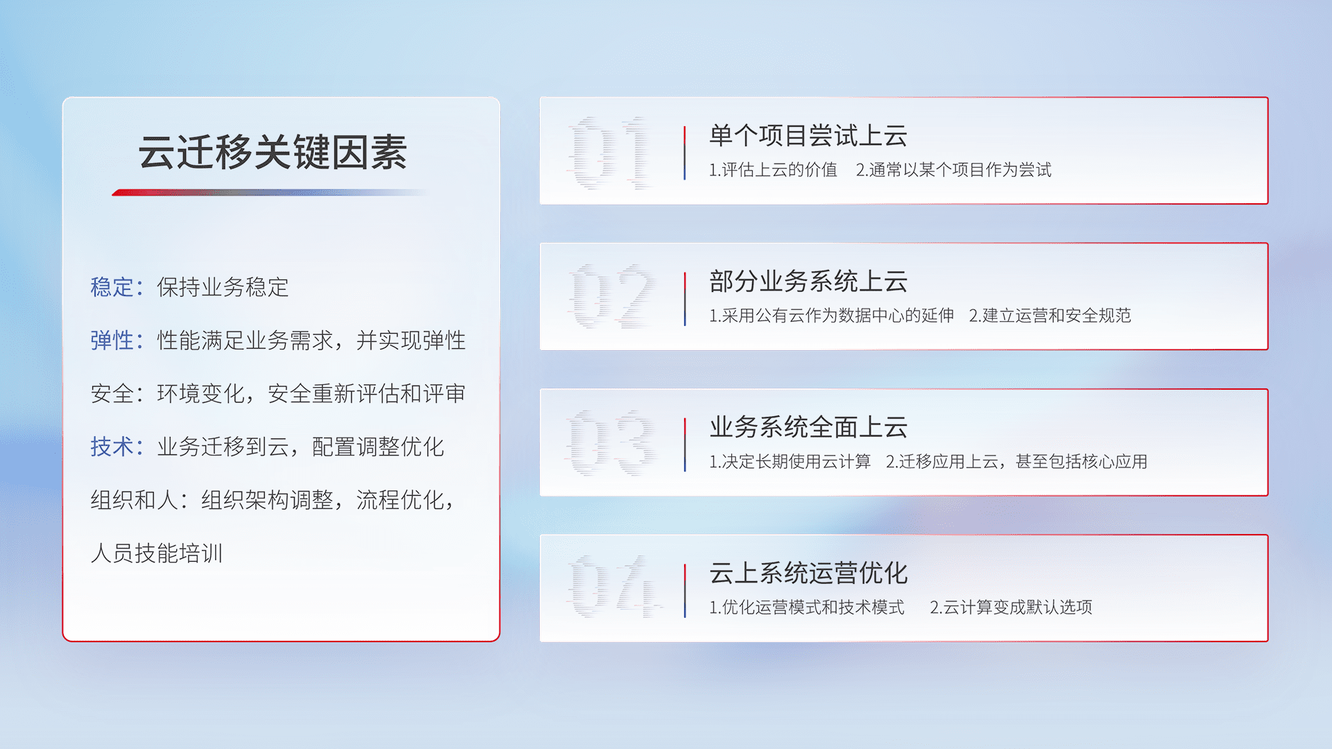 结合实际业务,,,,从规划设计、、云平台选型、、、云原生改造、、、数据迁移、、、集成交付,,,,迁移全过程为客户识别最佳上云路径,,做好风险识别管理,,设计网络架构、、、、身份权限、、、安全审计合规、、操作审计、、日志审计、、监控告警策略、、、多站点容灾设计等,,,对云上基础设施进行整体规划,,提升IT治理水平,,,,以满足弹性、、、、高可用、、、、高性能的需求。。