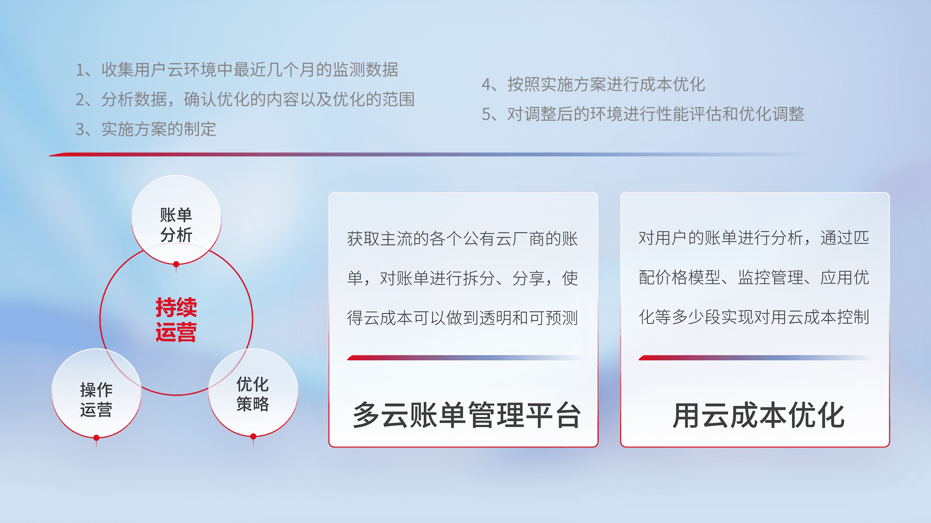 通过多云纳管,,以统一的资源数据模型把客户的云资源进行抽象和封装,,进而实现对多云资源的统一操作,,,,保障云资源管理的可靠性、、、、稳定性与可用性。。量身定制化运维内容,,,,配置、、、开发运维、、、补丁管理、、、、备份、、、、监控、、、认证和访问管理、、审计和日常巡检等,,,保障在用云过程中的可靠度,,稳定度以及高可用率。。。